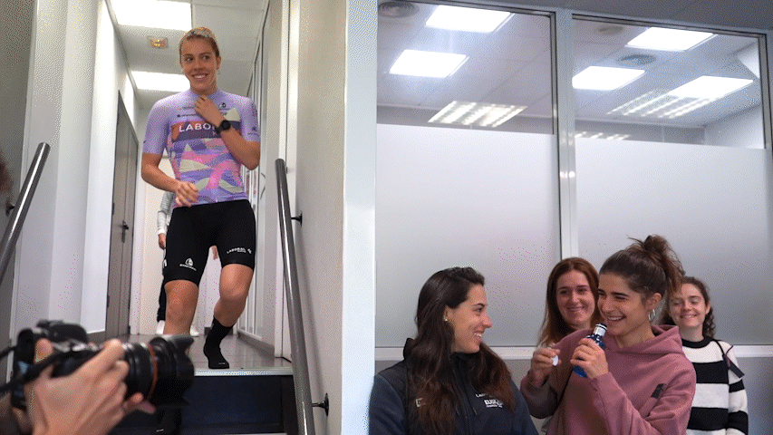Tras una calurosa bienvenida arrancó el plan para pillar al equipo desprevenido y que se encontraran con la nueva equipación por sorpresa. Usoa Ostolaza abandonó el grupo un momento para mudarse de piel, y apareció para sorprenderles con un conjunto totalmente inédito hasta la fecha. Un diseño fresco, con nuevos colores y nuevos elementos que enamoraron desde el primer momento a las corredoras de Laboral Kutxa.