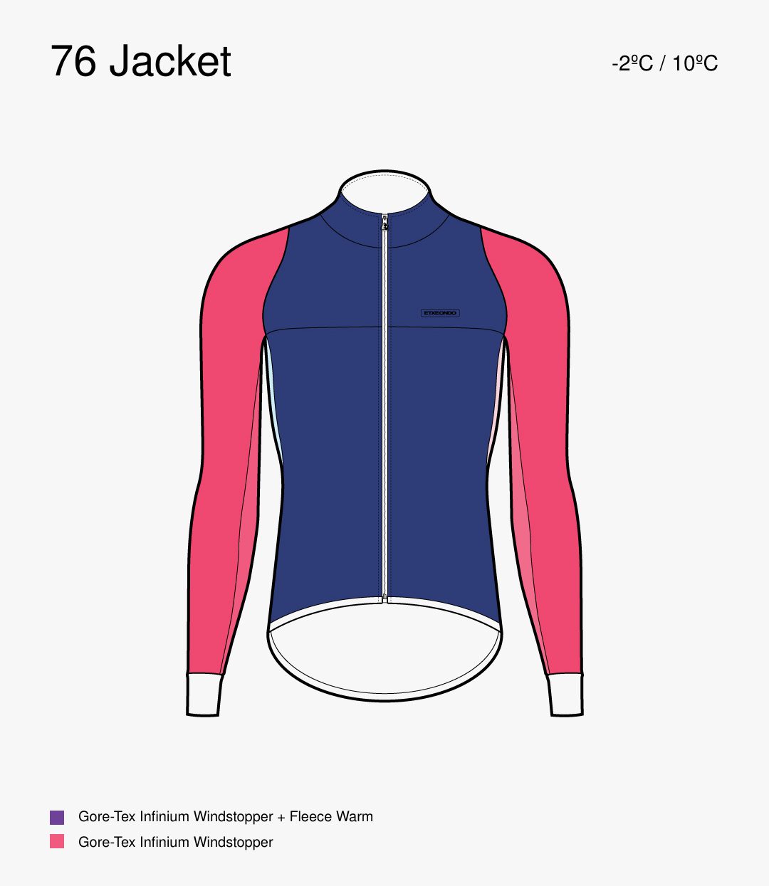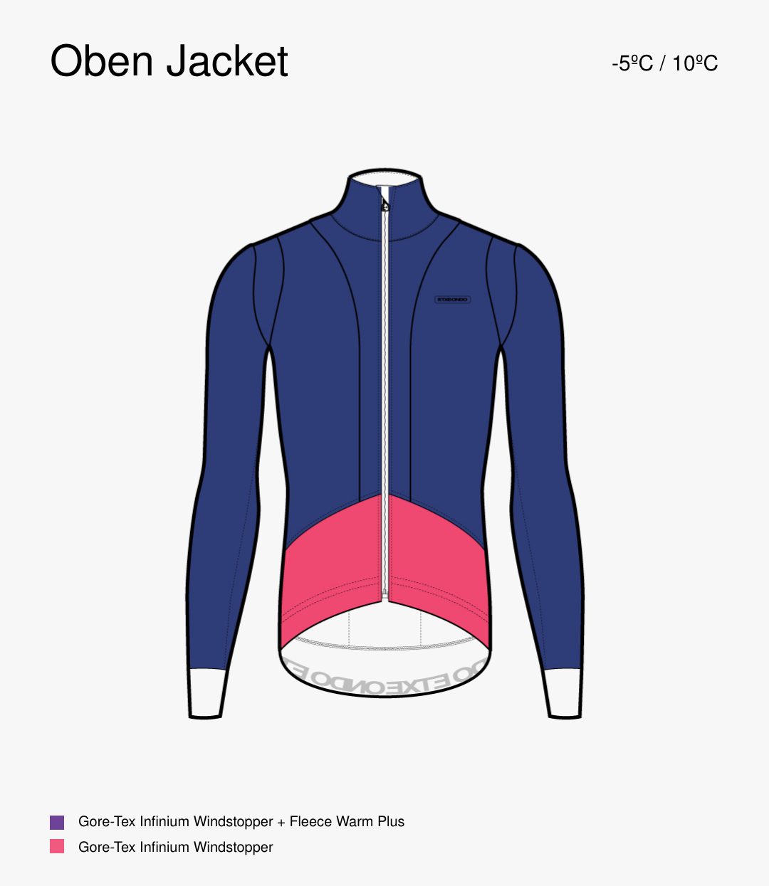The Oben is Etxeondo´s most suitable jacket for riding in the coldest conditions. It is designed to work from -5ºC through to a maximum of 10ºC. A combination of Gore-Tex Infinium Windstopper fabric throughout, with a Fleece Warm Plus lining on the chest, back and arms guarantees warmth in the harshest conditions. Infinium shuts out the wind; Fleece Warm Plus generates small pockets of warm air that isolate us from the cold.