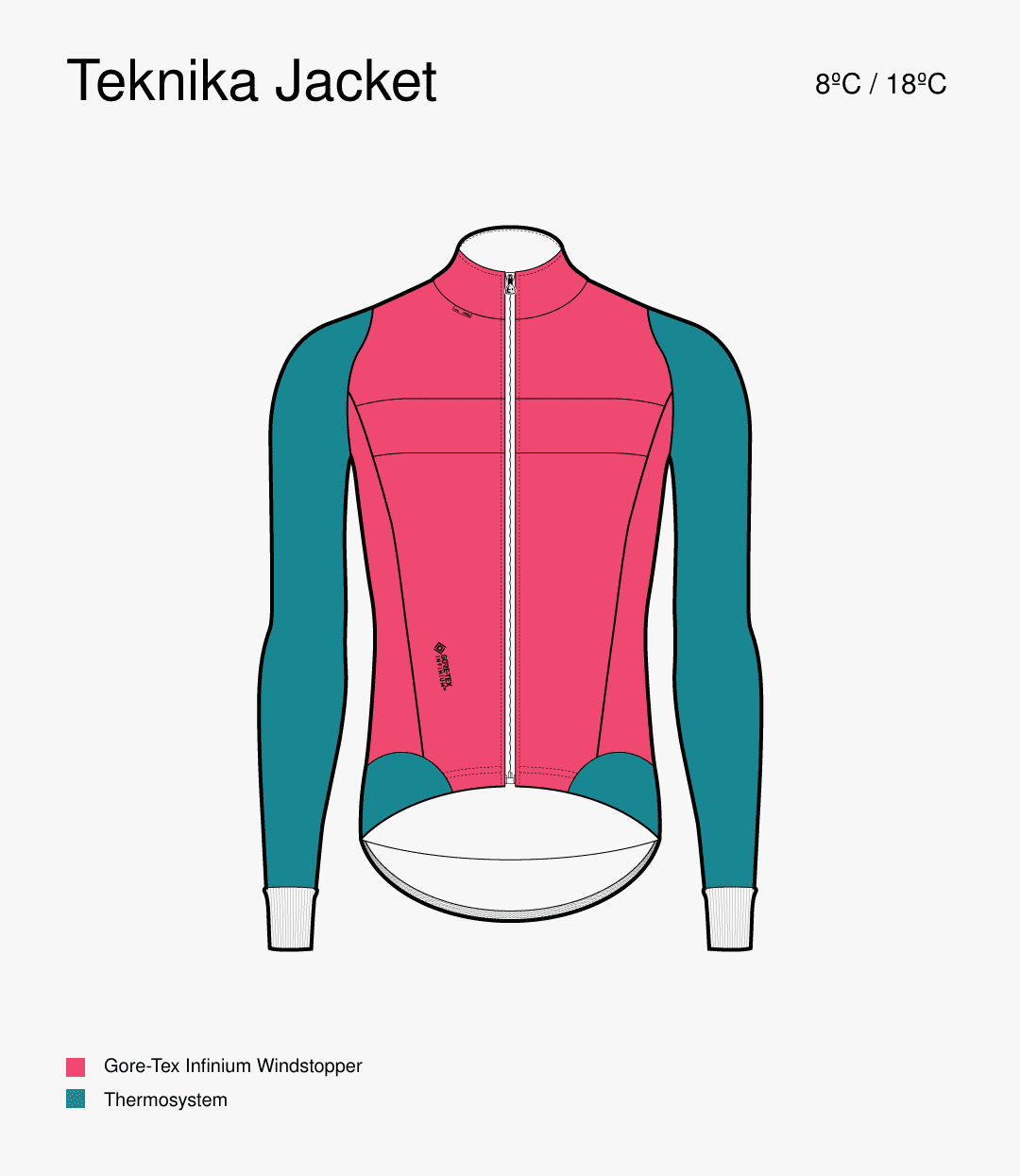Teknika is a lightweight and highly comfortable jacket. It feels similar to wearing a thermal jersey with a Windstopper vest on top, yet now combined in one single garment. The Gore-Tex Infinium fabric on the chest and upper part of the back blocks the wind; the sleeves and lower back are made of Thermosystem fabric which facilitates breathability and flexibility.
