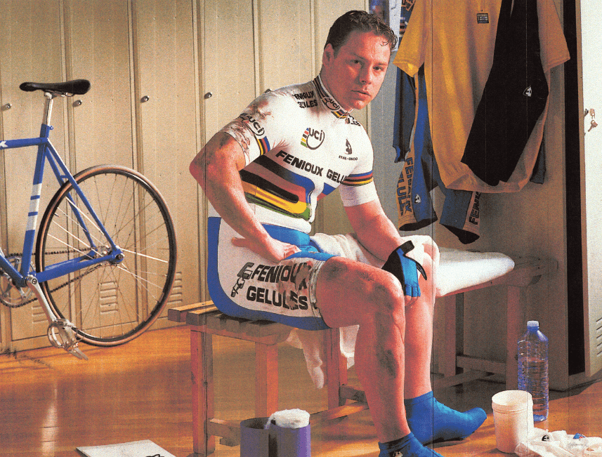 NUEVOS CICLISMOS, NUEVAS PRENDAS Las primeras colecciones de aquella época fueron muy sobrias.- Diseñamos maillots de colores lisos, con algunos pequeños toques como los zigzags o algunos recubiertos -dice María Jesús-. Me acuerdo de un maillot negro con un recubierto rojo en el cuello: eso no se había visto nunca, ¡un maillot negro! Los comerciales se asustaban: “¡A ver cómo vendemos esto!”. Pues fue un exitazo. Empezamos con un diseño minimalista.Las colecciones tomaron algunas prendas clásicas de Etxeondo y las evolucionaron. El culote olímpico, por ejemplo, era un culote negro de una licra brillante, con muchos cortes, muy anatómico, que se vendía con éxito desde los años 80. El siguiente paso fue el culote dinámico, que solo tenía dos piezas, para evitar las costuras, y con él ya desplegaron una gama de colores: culotes blancos, rojos, azules, culotes con dibujos estampados...